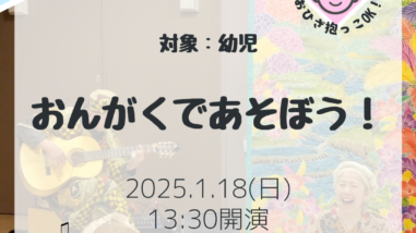 鑑賞例会 1/18(日)鑑賞例会(幼児) 「おんがくであそぼう!」リーフ企画 会員は無料で鑑賞できます!(会費月2000円)対象:幼児親子(0~2才お膝抱き入場OK!事前申込制)開演:13:30(上演時間約45分+楽器体験15分)場所:鶴川市民センター第2会議室歌子さんの澄んだ歌声と、ぴんたろーの奏でるギターや不思議... 鑑賞例会